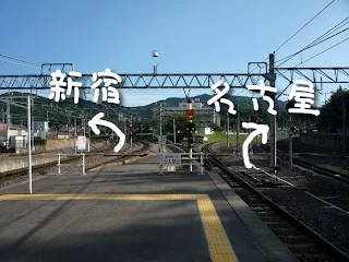 塩尻駅は中央本線の分水嶺で、左に行けば”あずさ”の走る新宿方面、右は”しなの”が走る名古屋方面。 ちなみに、どちらも、塩尻から発車する電車が”上り”で、塩尻に向かってくるほうが”下り”なんだよね。