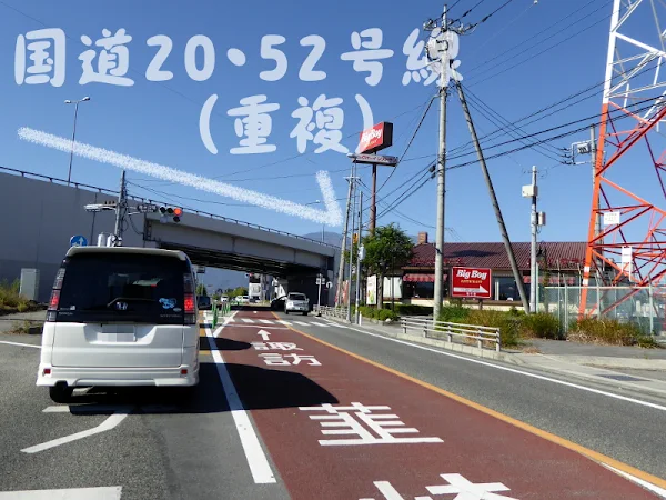 甲府から5キロほど進むと、国道20号線と竜王立体交差点でぶつかり、ここから3キロほどは国道20号線との重複区間となる。